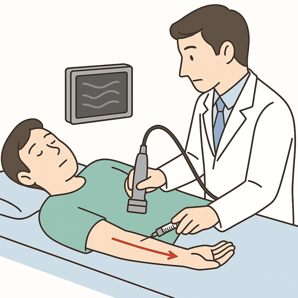 動注治療は、超音波検査(エコー)で血管を確認しながら、手首や足首の動脈に細い針を挿入し、特殊な薬剤を注入する方法です。この薬剤は不要に増えた「モヤモヤ血管」に作用し、炎症や痛みの軽減を目指します。処置自体は10分程度で完了し、症状や疾患によっては高い鎮痛効果が期待できます。